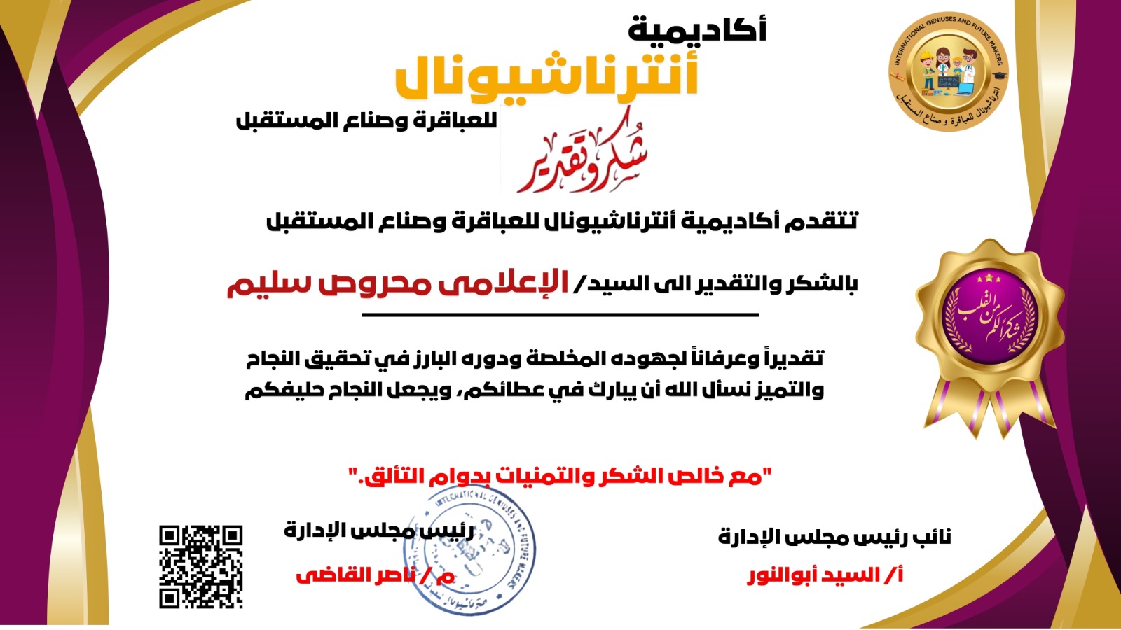 كرمت اليوم أكاديمية إنترناشيونال للعباقرة وصناع المستقبل ، برئاسة المستشار ناصر القاضي ، والاستاذ السيد أبوالنور نائب رئيس مجلس الإدارة ، والخبير الإعلامي الدكتور محمد الصبروت ، محروس سليم المستشار الإعلامي للنقابة العامة للسكة الحديد ومترو الأنفاق ، ونادي سكك حديد الزقازيق ، تقديرا وعرفانا لما يبذله من جهد مخلص ، ودوره البارز في تحقيق النجاح والتميز .